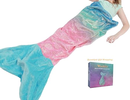 Viviland Meerjungfrau Decke Fur Jugendliche Madchen Super Weiche Plusch Flanell Schlafsack Decke Fischschuppen Muster Glanzender Regenbogen Blau